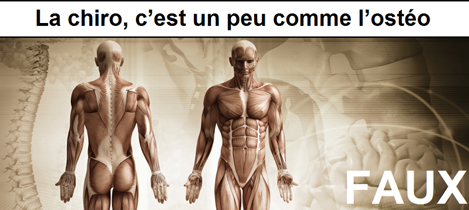 La chiro, c’est un peu comme l’ostéo. FAUX La chiropraxie et l’ostéopathie sont deux médecines manuelles reconnues par le ministère de la santé publique et spécialisées dans la prise en charge des troubles de l’appareil locomoteur. Toutefois les deux thérapies se distinguent en de nombreux points. Le plus important, c’est que le chiropracteur est autorisé à prendre en charge des troubles pathologiques, c’est-à-dire des affections avérées par imagerie médicale, comme la sciatique ou la hernie discale, par exemple. Au contraire, l’ostéopathie est limitée à la prise en charge des troubles fonctionnels, comme les douleurs liées à la sur utilisation d’une articulation. Ce champ de compétence plus étendu se justifie par la qualité de la recherche scientifique dans ce domaine et une formation de qualité homogène et basé sur la recherche , qui est proche de celle des étudiants en médecine. A noter : Le chiropracteur est le seul thérapeute non médecin autorisé à pratiquer des manipulations vertébrales sans autorisation médicale préalable.