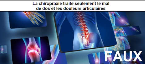 Plus facile la vie avec la chiropraxie ! VRAI. Votre chiropracteur apporte une réponse adaptée aux principaux troubles de la colonne vertébrale et des articulations. Il soulage également certains maux de tête et de nombreux patients affirment ressentir une amélioration des problèmes viscéraux qui les affectent. Votre chiropracteur vous dispense des conseils posturaux et d’hygiène de vie pour améliorer votre santé et votre bien-être au quotidien.